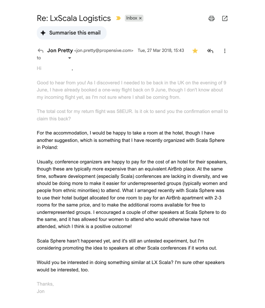 When I organised my own conference, Scala World, which took place in rural England, I encouraged speakers to share group accommodation. I did not separate male and female speakers, but everyone always had a private room. Speakers were encouraged to bring their partners. This created a community spirit which was generally appreciated. In this respect, I organised accommodation for Scala developers, several of whom were women.