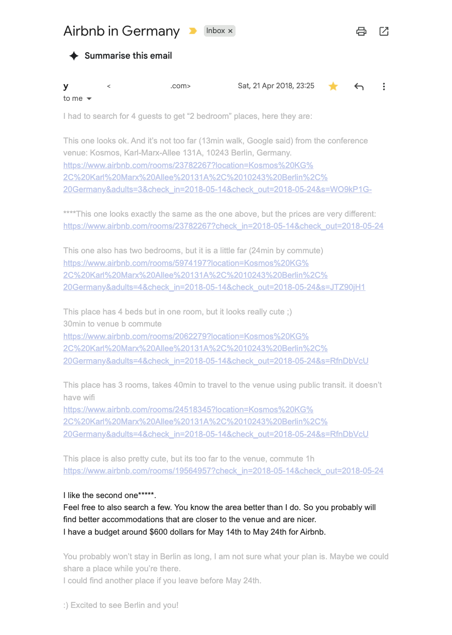 Email from me to LX Scala organizers proposing shared AirBnb accommodation
