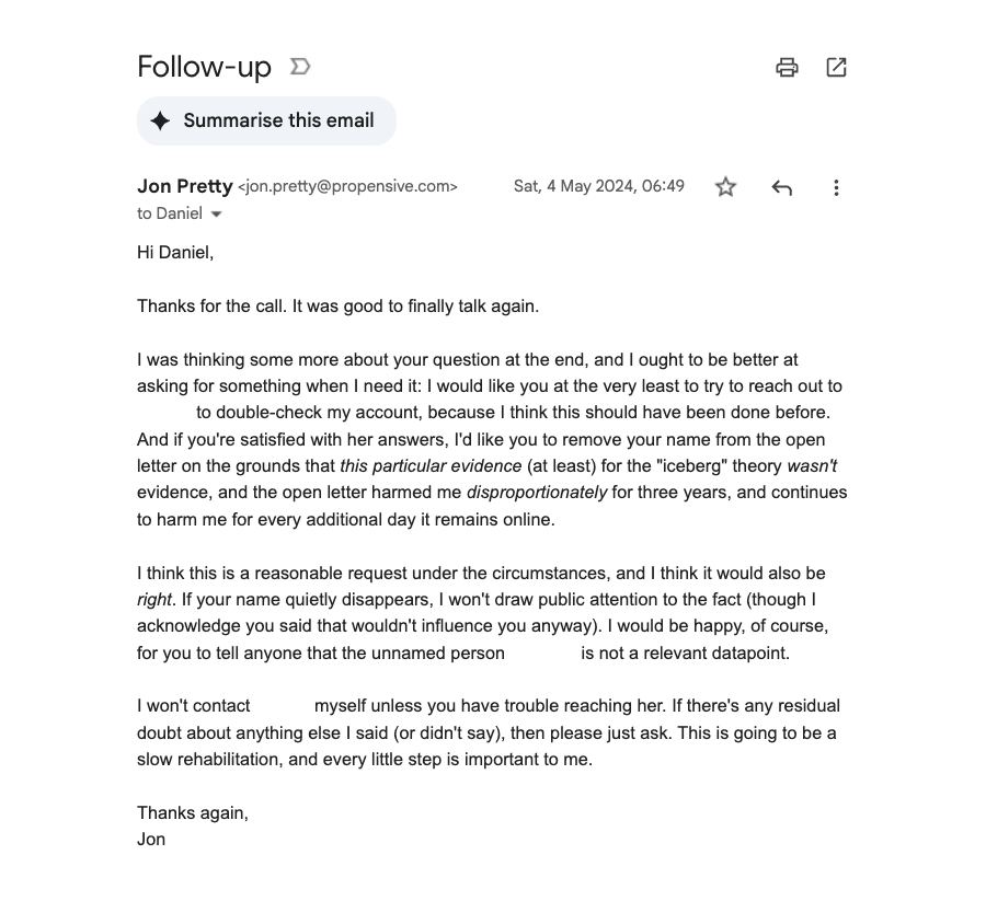 He also said that the evidence against me was like an “iceberg”, by which he meant that the “evidence” published on 27 April 2021 was a small fraction of the total. I do not believe this. After I challenged him on this, he also commented, regretfully, that his decision not to ever speak to me about it as “a miss”.