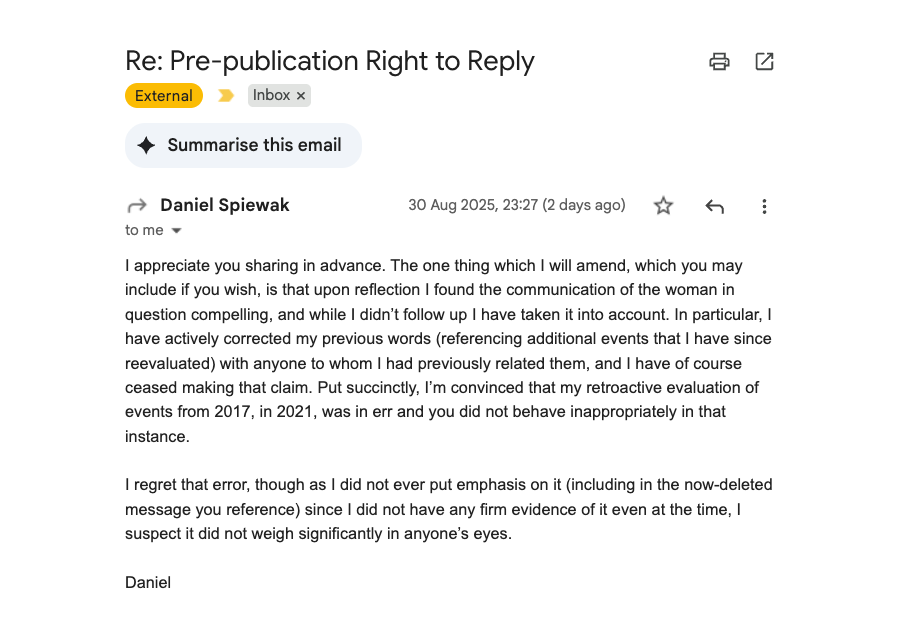 Several months later, I asked the woman in question to try to contact Mr Spiewak on my behalf. She attempted to contact him via two different means, and he did not reply to her. As of 30 August 2025, he has never responded to her request. He remains a signatory to the Open Letter.